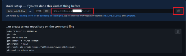 레파지토리 이름을 설정하고 public과 private 중에 선택한 후 하단에 Create repository 버튼을 누르면 git 레파지토리 생성은 끝이다