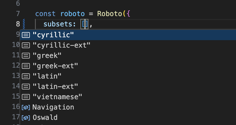 따라서 layout.tsx에서 폰트를 변경해준다. 로컬에 저장된 폰트를 사용하는 것 말고도 next/font를 활용해 구글 폰트를 가져올 수도 있다. 나는 roboto와 oswald 구글 폰트가 필요했기 때문에 이 두 폰트를 불러와서 변수에 담아 사용했다.