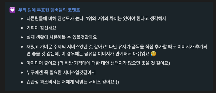 다음 날인 일요일 오후 3시에 제출이 마감되었고, 화요일에 발표가 났는데 아쉽게도 1등은 달성하지 못했다. 그래도 13팀 중에 2등이나 했으니 이것만으로도 만족했다. 게다가 우리 서비스에 달린 코멘트 중에 완성도가 높다는 평이 있어서 열심히 QA를 진행한 보람이 있었다. 또, 실생활에 사용할 수 있을 것 같다는 평들로 보아 수요가 있을 수도 있겠다는 생각이 들었다. 이렇게 투표한 팀에게 코멘트를 남겨 피드백을 받을 수 있는 부분은 좋았다.
