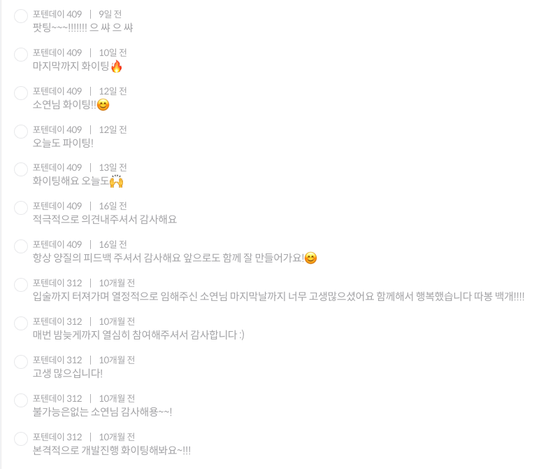나는 칭찬을 받으면 더 잘하려고 노력하는 편이다. 포텐데이에서는 프로젝트 기간 동안 매일 익명으로 하루에 한 번씩 팀원 중에 한 명에게 박수와 함께 멘트를 남기는 시스템이 있다. 팀원에게 박수를 보낼지 말지, 멘트를 남길지 말지는 본인이 자유롭게 선택할 수 있다. 박수와 멘트를 받으면 더 힘이 나고 열심히 해야겠다는 생각이 든다. 나도 매일 팀원에게 박수와 멘트를 남겼는데, 아마 받았던 팀원도 보면서 더 힘이 나지 않았을까? 익명이기 때문에 자유롭게 피드백을 주고 싶은 경우에도 좋을 것이라 생각한다.