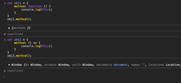 반면에, obj2.method()는 화살표 함수로 선언된 메서드를 호출했다. 화살표 함수는 this가 정의될 때의 상위 스코프에서 값을 lexical하게 가져온다. 즉, 화살표 함수는 호출되는 방식과 상관없이 함수가 정의된 위치에 따라 상위 함수 스코프 또는 전역 스코프에서 this를 가져온다. obj2.method()의 this는 화살표 함수가 정의된 위치인 전역 스코프의 this를 참조하게 되므로 브라우저 환경에서 Window 객체가 된다.